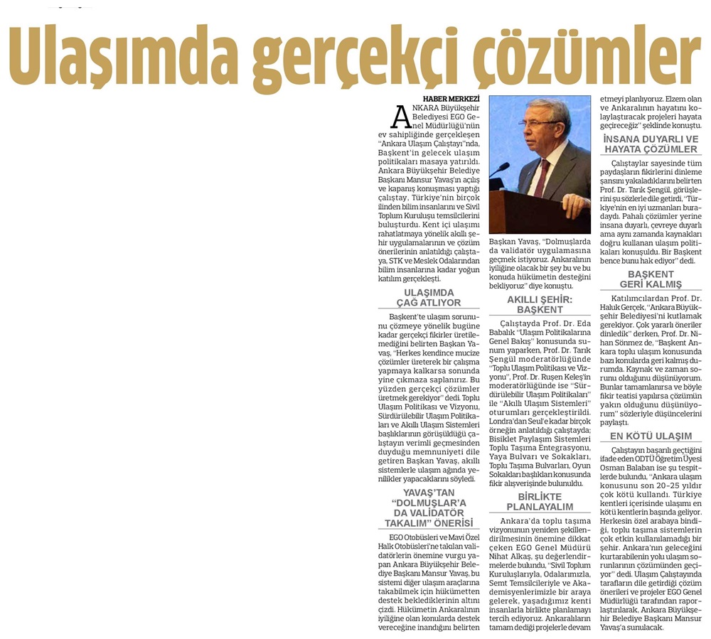 Ankara Anadolu Gazetesi / 26.11.2019 Ulaşımda gerçekçi çözümler