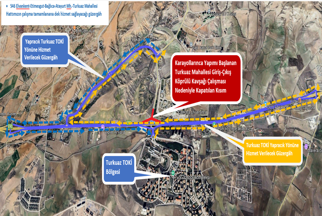 Karayolları 4. Bölge Şube Müdürlüğü tarafından başlatılan Turkuaz Mahallesi giriş çıkış köprülü kavşak çalışması dolayısıyla, Yapracık ve Turkuaz TOKİ Bölgelerine hizmet sağlayan otobüs hatlarımızın güzergâh ve duraklarında geçici olarak değişiklik yapılmıştır