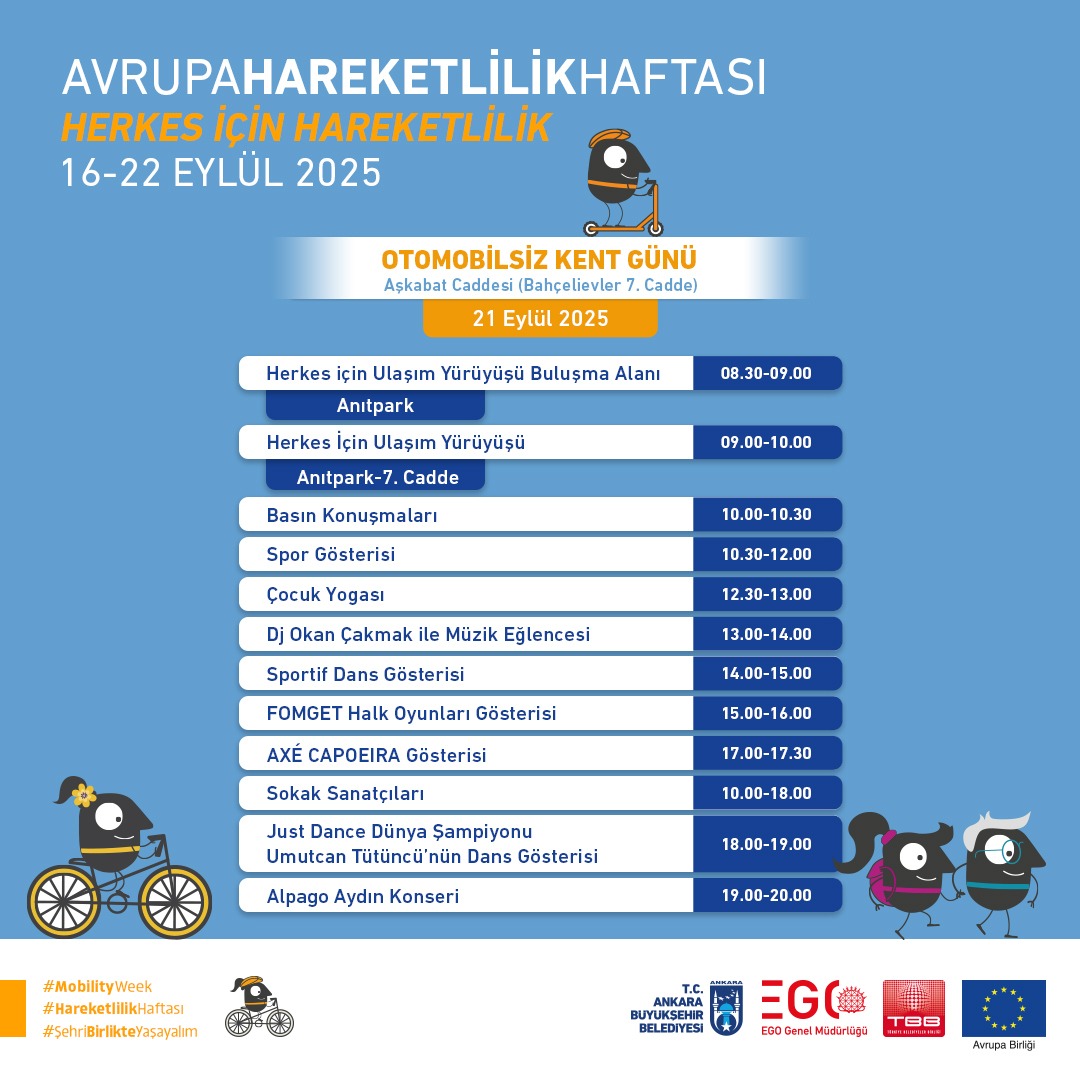 2019 yılından itibaren EGO Genel Müdürlüğümüz koordinasyonunda hazırlanan yedinci Avrupa Hareketlilik Haftası kapsamında hafta boyunca pek çok etkinlik planlanmıştır. “Herkes İçin Hareketlilik” temasıyla gerçekleştireceğimiz etkinliklere tüm Ankaralıların katılımlarını bekliyoruz.