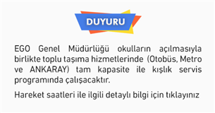 Milli Eğitim Bakanlığına bağlı ilk ve ortaöğretim kurumları, 23 Ocak-03 Şubat 2023 tarihleri arasında “Yarı Yıl Tatili”ne gireceklerdir. Bu kapsamda, Kuruluşumuz EGO Genel Müdürlüğünce verilen toplu taşımacılık hizmetinde faaliyet gösteren hat ve güzergâhlarımızda (Otobüs, Metro, ANKARAY) 23 Ocak -03 Şubat 2023 tarihleri arasındaki servis saatleri yeniden düzenlenmiştir.