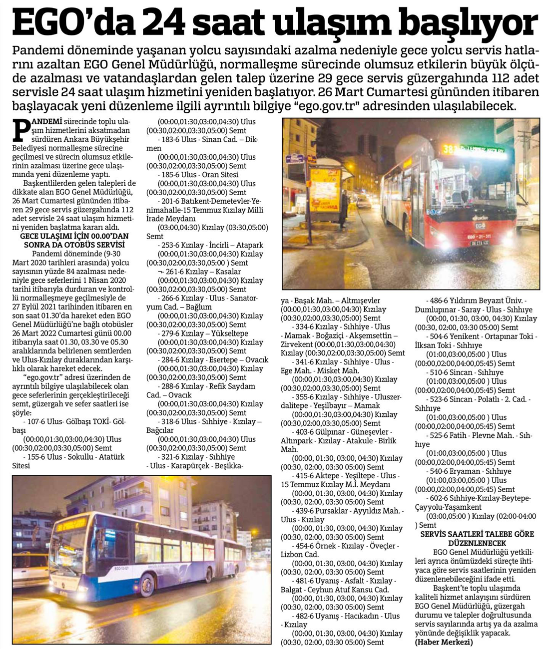 Başkent Gazetesi / 26.03.2022 EGO otobüsleriyle 24 saat ulaşım