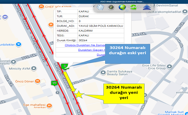 Natoyolu Caddesi üzerinde bulunan 30264 numaralı kapalı durağın bulunduğu yerde metro çalışması olduğundan dolayı 11.04.2026 tarihinde saat 22:00 dan sonra 330, 336-1, 336, 340, 341, 341-6,346 386, 731 ve 732 numaralı hatlarımızın yolcuları 80 metre gerideki bulunan tabela durağı kullanmaları gerekmektedir.