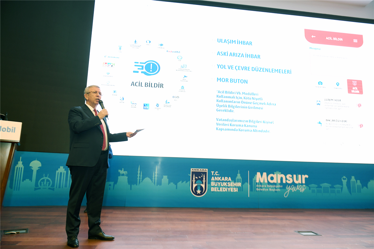 Akıllı cep telefonlarına indirilecek uygulama sayesinde acil bildir butonu ile sesli ya da sessiz seçeneğiyle vatandaşların anında belediyeye ulaşabileceğini belirten Başkan Yavaş, Başkent153’ten (Yeni Mavi Masa) nöbetçi eczanelere, devam eden çalışmalardan trafik durumuna, ASKİ online işlemlerden Kültür Ankara’ya, otobüslerin nerde olduğundan ANKARAKART bakiyesine kadar birçok hizmete ulaşılabileceğini ifade etti.
