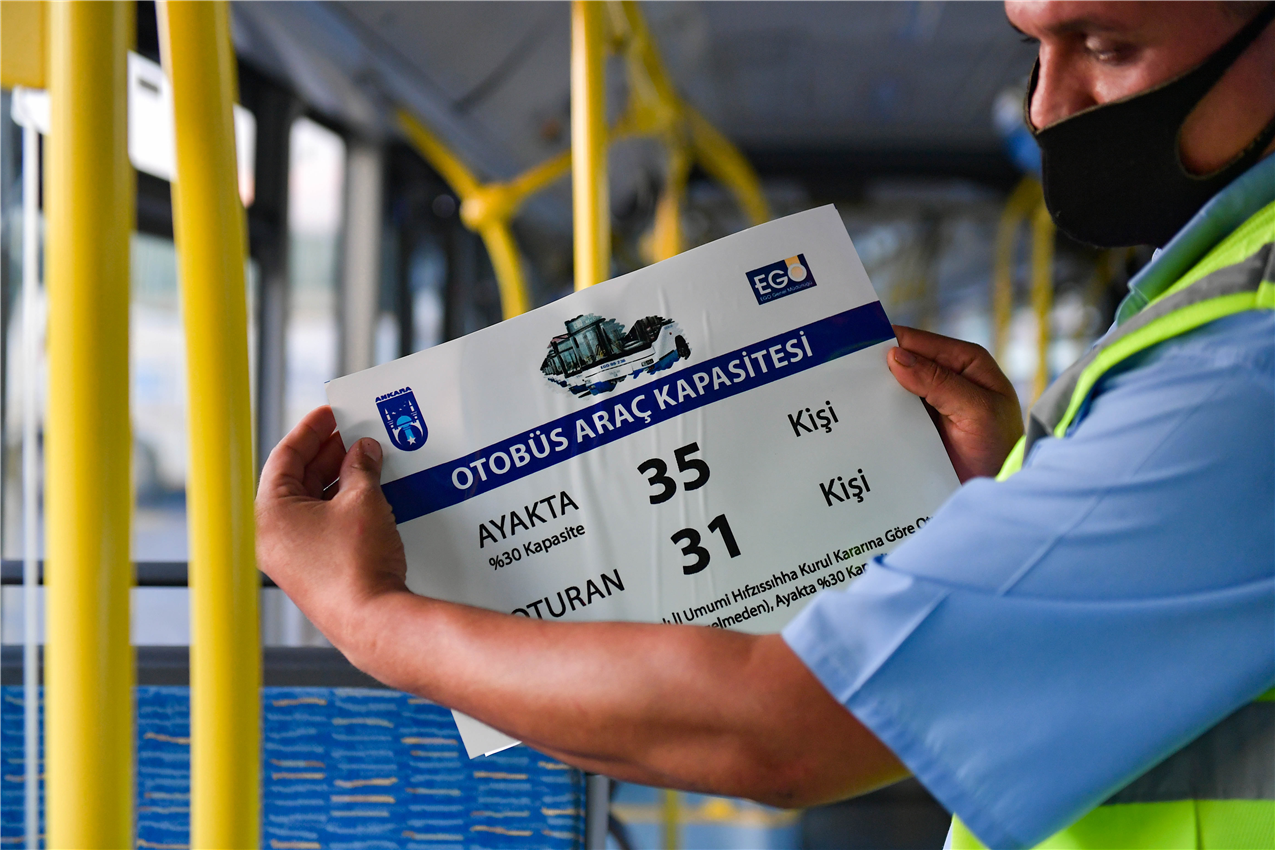 EGO Genel Müdürlüğü, İl Umumi Hıfzıssıhha Kurulu tarafından alınan karar doğrultusunda vatandaşların en az 1 metre sosyal mesafe kuralına uyması için EGO’ya ait toplu taşıma araçlarına zemin yapıştırmalarının ardından, yolcu taşıma kapasitelerine ilişkin bilgilendirme etiketleri de yapıştırıyor.