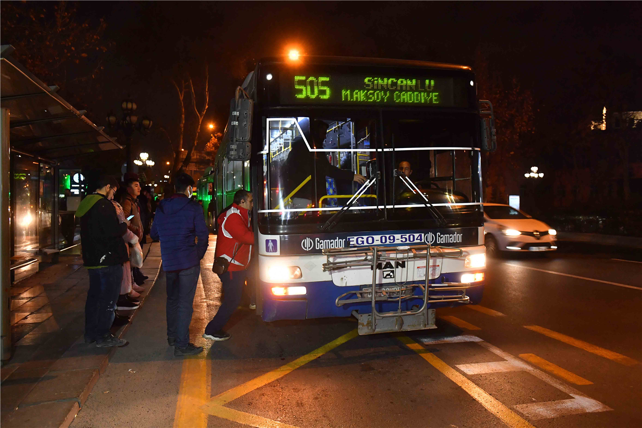 EGO Genel Müdürlüğü, Ankaralıların gece saatlerinde de ulaşımlarını rahat bir şekilde sağlayabilmesi amacıyla pandemi döneminde verilen aranın ardından mart ayında tekrar başlattığı 24 saat kesintisiz ulaşım hizmetine devam ediyor.