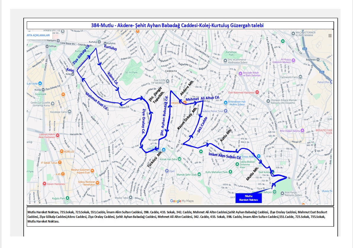 • 384 Mutlu – Akdere – Şehit Ayhan Babadağ Caddesi – Kolej – Kurtuluş (Ring)