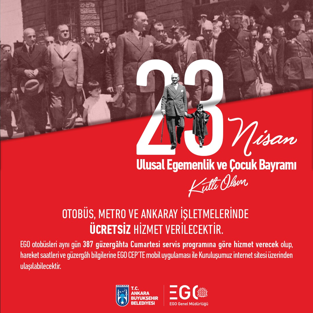 23 Nisan Ulusal Egemenlik ve Çocuk Bayramı’nda, EGO Genel Müdürlüğünce yürütülen otobüs, Metro ve ANKARAY İşletmelerinde toplu taşıma hizmetleri ücretsiz olacaktır.