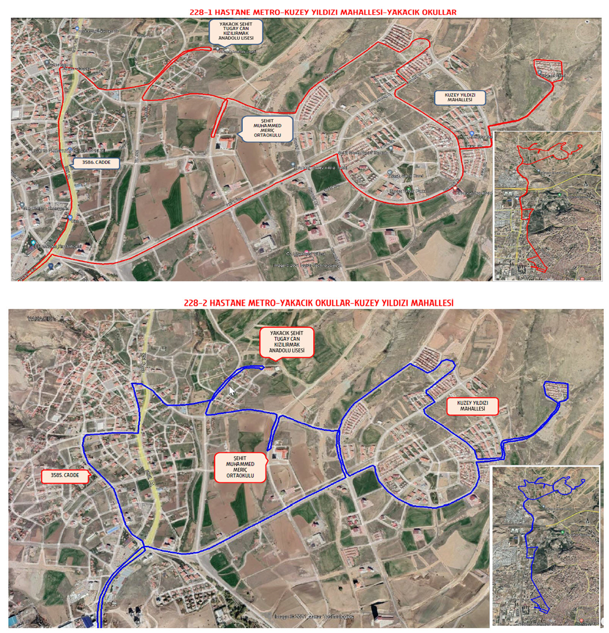 Kuruluşumuz Otobüs İşletme Dairesi Başkanlığına Bağlı 2.Bölge Otobüs İşletmesi Şube Müdürlüğü hizmet alanları içerisinde bulunan, Yenimahalle İlçesi, Yakacık Mahallesinde bulunan Şehit Tugay Can Kızılırmak Anadolu Lisesi ve Kuzey Yıldızı Mahallesinde bulunan Şehit Muhammed Meriç Ortaokulu öğrencilerinden gelen talep ve başvuruları değerlendirilmiş olup; gidiş güzergahında “228-1 Hastane Metro-Kuzey Yıldızı Mahallesi-Yakacık Okullar” flama adlandırılması, dönüş güzergahında “228-2 Hastane Metro-Yakacık Okullar -Kuzey Yıldızı Mahallesi” hizmet vermek üzere hat tahsis edilmiştir. Uygulamaya 08.11.2021 (Pazartesi) günü başlanılacak olup yolcularımıza önemle duyurulur.