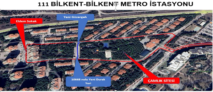 20.10.2025 Pazartesi günü itibarıyla, 111 BİLKENT – BİLKENT METRO İSTASYONU hattının güzergâhında düzenleme yapılmıştır. Yapılan düzenleme kapsamında, Çamlık Sitesi içerisinde yer alan Eldem Sokak üzerinde meydana gelebilecek çökme riski nedeniyle güzergâhı iptal edilmiş olup, hat güzergâhı bir önceki sokak üzerinden devam edecektir.