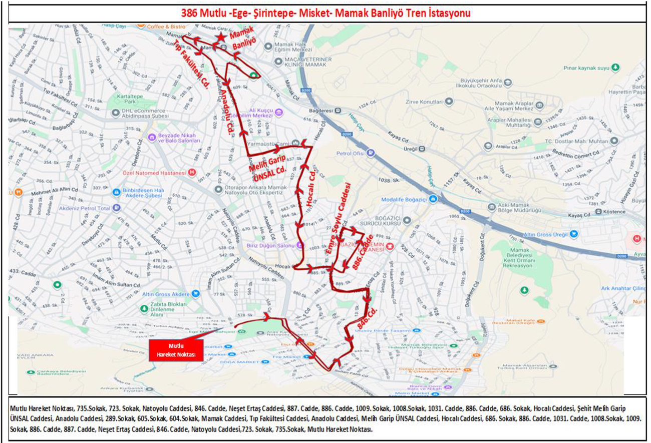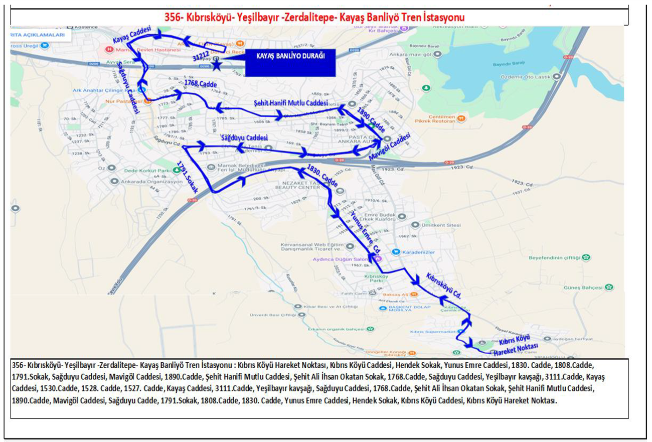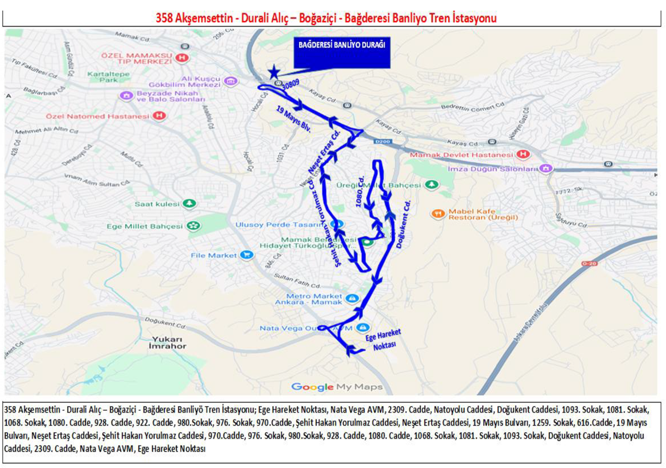 EGO Genel Müdürlüğünce ; Ankaray Dikimevi bağlantılı Natoyolu metro inşaat çalışmaları devam etmesi sebebiyle projede belirlenen alanların yapım işi tamamlanana kadar Kıbrısköyü Mah., Yeşilbayır Mah., Yeni Bayındır Mah., Küçük Kayaş Mahallelerine hizmet veren 355,357,374 ,361 numaralı hatları, Akşemsettin Mah., Durali Alıç Mah., Boğaziçi Mahallelerine hizmet veren 351, 353 numaralı hatları ve Mutlu, Cengizhan, Ege, Fahri Korutürk, Şirintepe, Şahintepe ve Misket Mahallelerine hizmet veren 330-340,346,338,365,367 numaralı hatları mevcut güzergahlarında hizmet verecek olup, alternatif olarak da sabah ve akşam yolcu yoğunluk oranlarının dengelenmesi için vatandaşlarımızın ulaşım hizmetlerinden en etkin ve verimli bir şekilde faydalanabilmeleri amacı ile Kayaş ,Bağderesi ve Mamak Banliyö tren istasyonuna aktarma yapacak şekilde 17.12.2025 tarihi itibariyle 356- Kıbrısköyü- Yeşilbayır -Zerdalitepe- Kayaş Banliyö Tren İstasyonu, 358 Akşemsettin - Durali Alıç – Boğaziçi - Bağderesi Banliyo Tren İstasyonu ve 386 Mutlu -Ege- Şirintepe- Misket- Mamak Banliyö Tren İstasyonu hatları ile toplu taşıma hizmeti verilmeye başlanılacaktır.