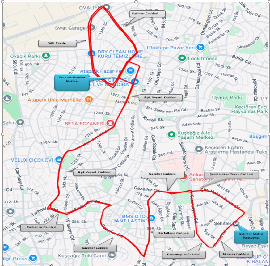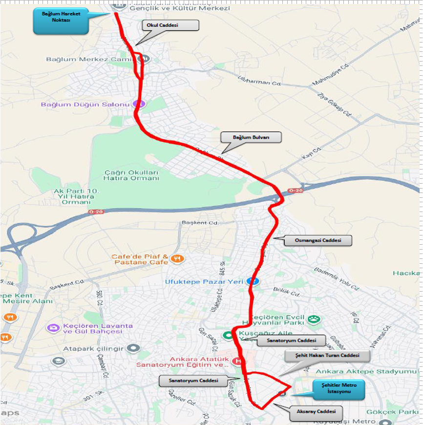 Güzergah: Atapark Otobüs Hareket Noktasından başlayarak, Pasinler Caddesi, 540. Cadde, Bağlama Caddesi, Tutal Caddesi, Aşık Veysel Caddesi, Tarhanlar Caddesi, Gazeller Caddesi, Kartaltepe Caddesi, Gazeller Caddesi, Şehit Hakan Turan Caddesi, Şehitler Metro İstasyonu Aksaray Caddesi, Sanatoryum Caddesi, Gazeller Caddesi, Tarhanlar Caddesi, Aşık Veysel Caddesi, Bağlama Caddesi, 540.Cadde, Atapark Otobüs Hareket Noktası