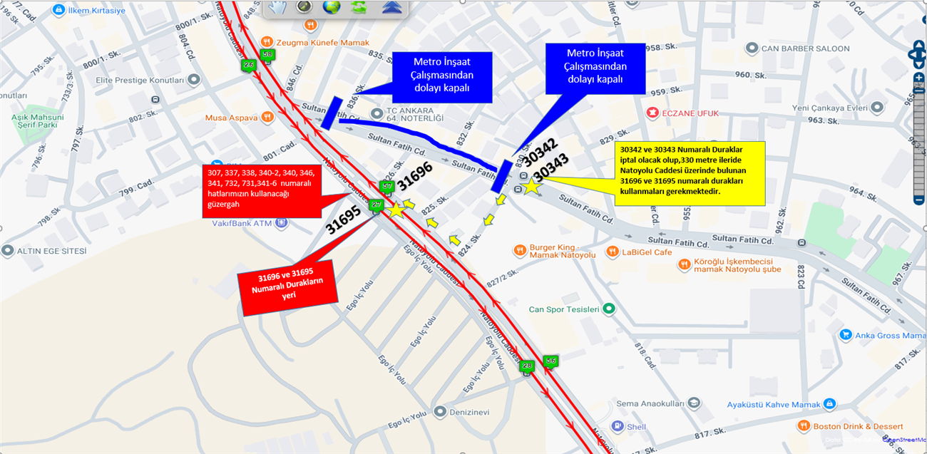 Vatandaşlarımızın mağduriyet yaşamamaları için Sultan Fatih Caddesi üzerinde bulunan 30342 ve 30343 numaralı durakların yeri değiştirilmiş olup, söz konusu duraktan geçen 307, 337, 338, 340-2, 340, 346, 341, 732, 731,341-6 numaralı hatlarımızı kullanan yolcularımız 330 metre ileride Natoyolu Caddesi üzerinde bulunan 31696 ve 31695 numaralı durakları kullanmaları gerekmektedir.