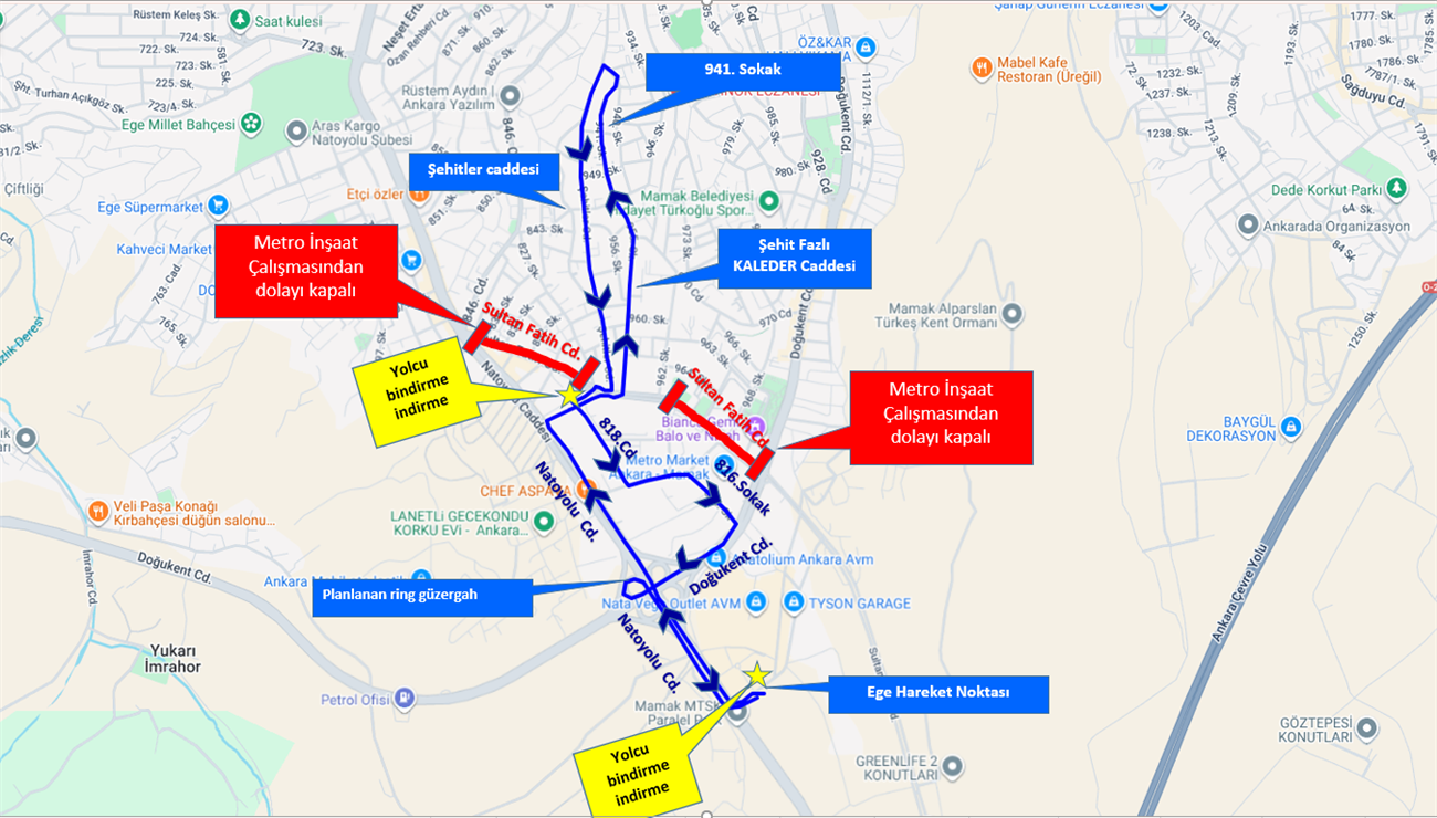 Dikimevi- Natoyolu metrosu kapsamında, Natoyolu İstasyonu Çalışmaları için Sultan Fatih Caddesi üzerinde 13.02.2026 Cuma tarihinde saat 23:00 itibari ile tam yol kapatma uygulaması yapılacaktır.