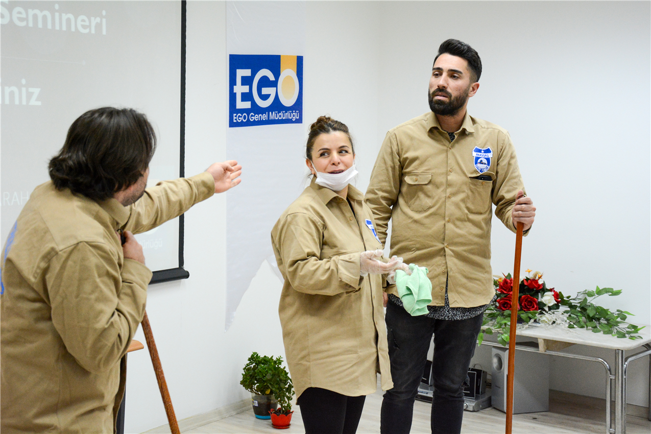 Temizlik personelinin kişisel gelişiminin arttırılması çerçevesinde stres ve öfke kontrolü başta olmak üzere etkili iletişim ve beden dili konularında verilen eğitime, Büyükşehir Belediyesi Kültür ve Sosyal İlişkiler Dairesi Başkanlığına bağlı tiyatro sanatçıları skeçleriyle, ayrıca sokak sanatçıları da müzik dinletisiyle renk kattı.