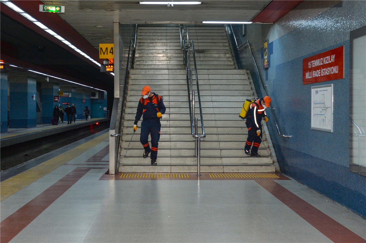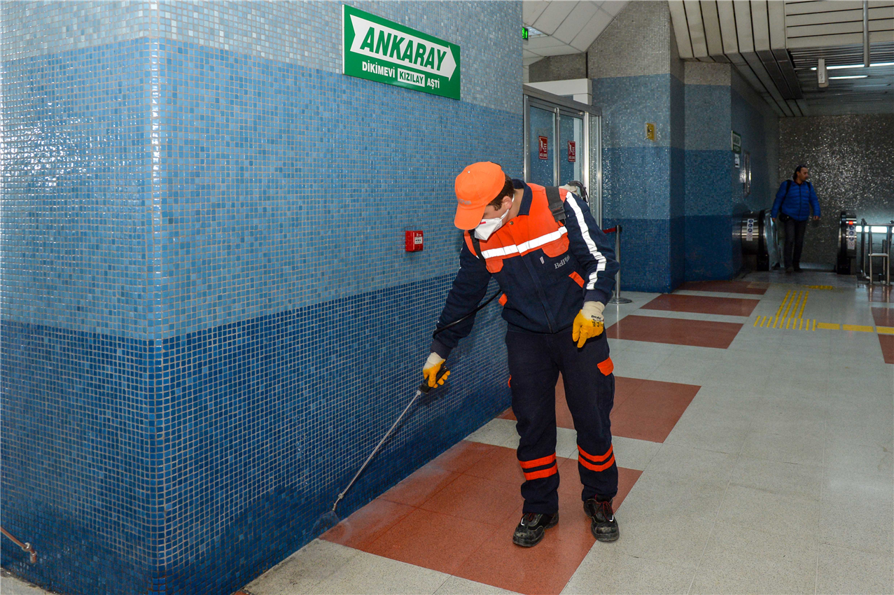 Metro ve ANKARAY’da her ay düzenli olarak dezenfekte işlemi, her hafta da temizlik çalışması yapılıyor. Vatandaşlardan 153 ALO Mavi Masa’ya gelen şikayetleri anında değerlendiren temizlik ekipleri, ihtiyaç duyulan noktalara anında müdahale ediyor. Merdivenler, tuvaletler ve ortak kullanım alanlarının tamamı temizlenirken, kirlilik oranları da ölçülüyor.