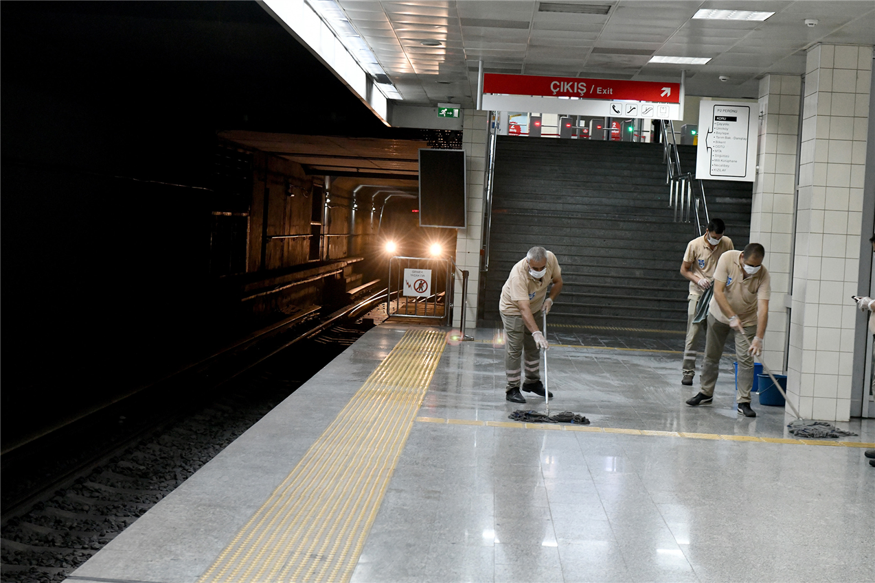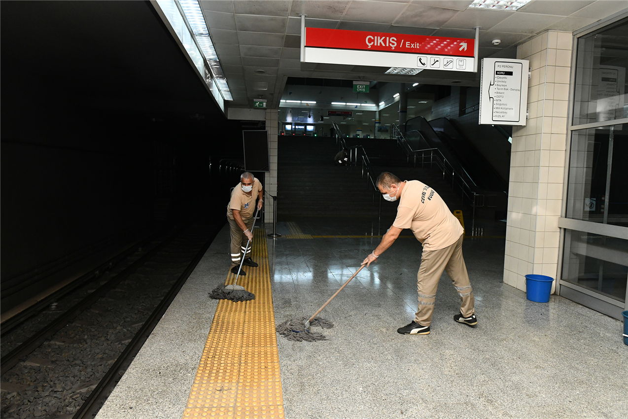 Ankara’da Covid-19 salgına karşı alınan önlemler kapsamında toplu taşıma araçlarında hijyen kurallarından taviz vermeyen Büyükşehir Belediyesi, normalleşme sürecine girilmesine rağmen temizlik ve dezenfeksiyon çalışmalarını aralıksız sürdürüyor. Sağlık İşleri Daire Başkanlığı ekipleri 7/24; Metro, ANKARAY ve EGO otobüslerinde hijyen çalışmalarına devam ediyor.