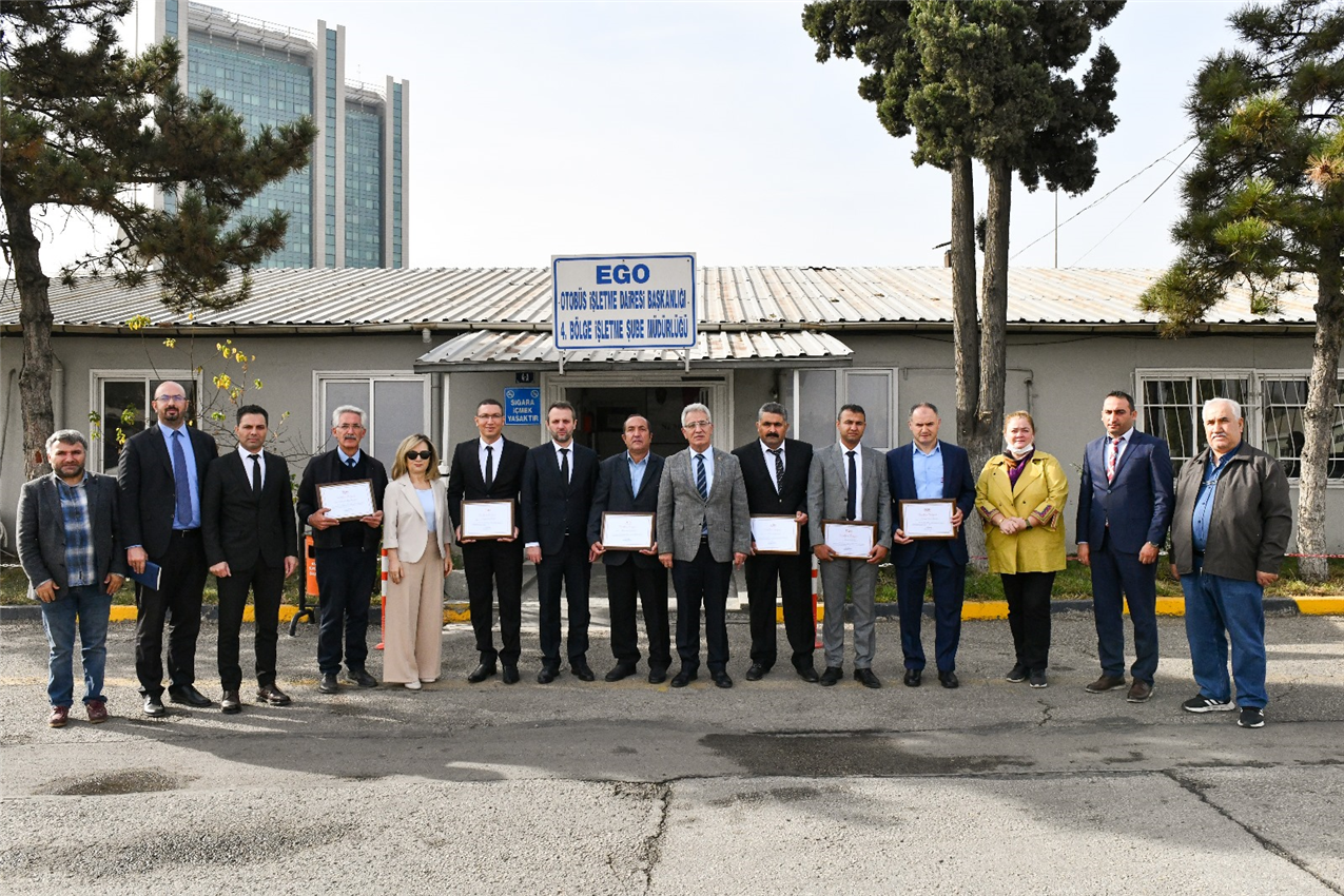 EGO Genel Müdür Yardımcısı Zafer Tekbudak, Hizmet İyileştirme ve Kurumsal Gelişim Dairesi Başkanı Ayten Gök ve Otobüs İşletme Dairesi Başkanı Yahya Şanlıer teşekkür belgelerini takdim etmek üzere “Ayın Şoförleri” ile 4. Bölge Otobüs İşletme Müdürlüğü’nde bir araya geldi.