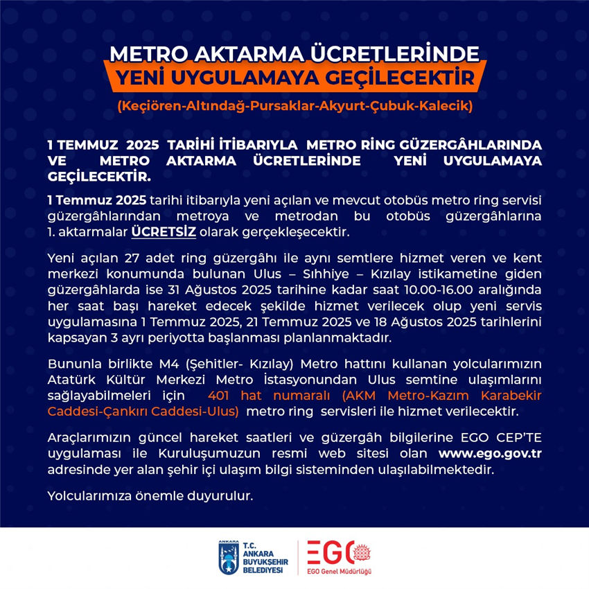 1 Temmuz 2025 tarihinden itibaren, EGO Genel Müdürlüğü’ne bağlı metro istasyonları ile otobüs ring hatları arasında yapılacak ilk aktarmalar ücretsiz olacak.