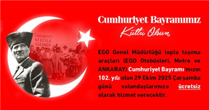 EGO Genel Müdürlüğü toplu taşıma araçları (EGO Otobüsleri, Metro ve ANKARAY) Cumhuriyet Bayramı’mızın 102. yılı olan 29 Ekim 2025 Çarşamba günü vatandaşlarımıza ücretsiz olarak hizmet verecektir.