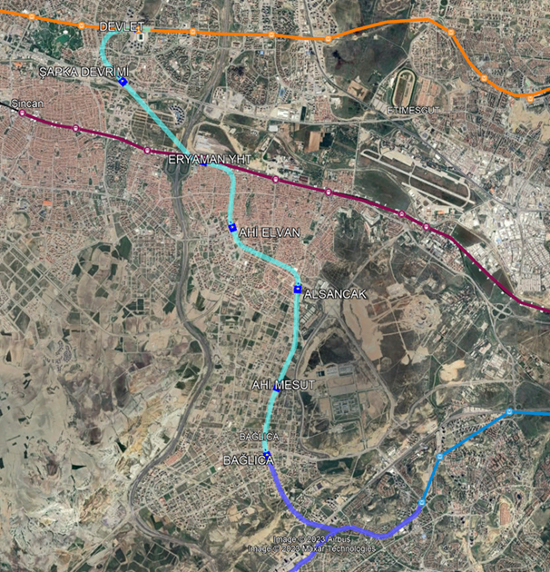 20.04.2018 tarih ve 6955 sayılı yazımız ile yapımını Ulaştırma ve Altyapı Bakanlığından talep ettiğimiz bu hattın M2 Çayyolu uzatma kapsamında Bağlıca İstasyonuna kadar projesini yaptığımızdan, Bağlıca sonrası da devam ettirilerek Başkentray’ın Eryaman YHT üzerinden M3 Sincan hattının Eryaman1-2 istasyonuna bağlama talebimiz Ulaştırma ve Altyapı Bakanlığı tarafından olumlu bulunarak gelen 18.04.2023 tarihli onay sonrası, 5 istasyon 11,6 km hattın proje ihalesi için çalışmalara başlanılmış olup Ankara Büyükşehir Belediyesi Meclisinden 09.06.2023 tarih ve 827 sayılı Karar ile Yetki alınmıştır.